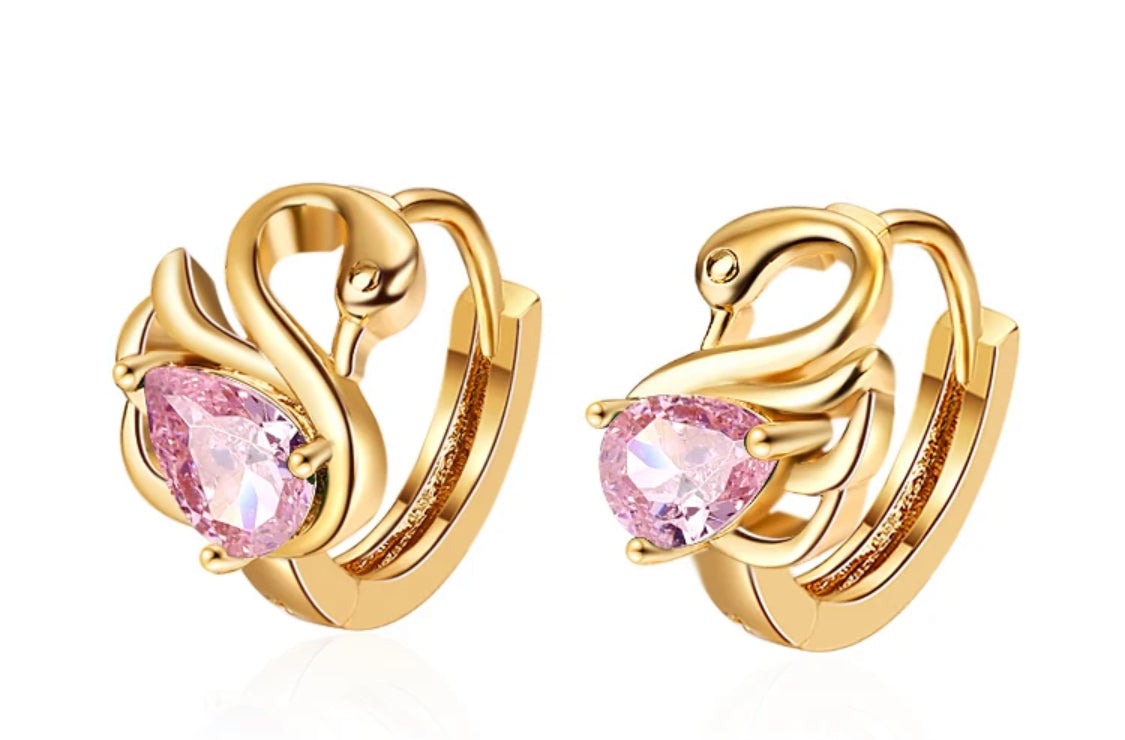 Elevate your style with our stunning Love Swans earrings, featuring pink cubic zirconia. Available in various colors, these long-lasting earrings are 18k gold plated for a touch of luxury. Make a statement with these elegant and timeless pieces.