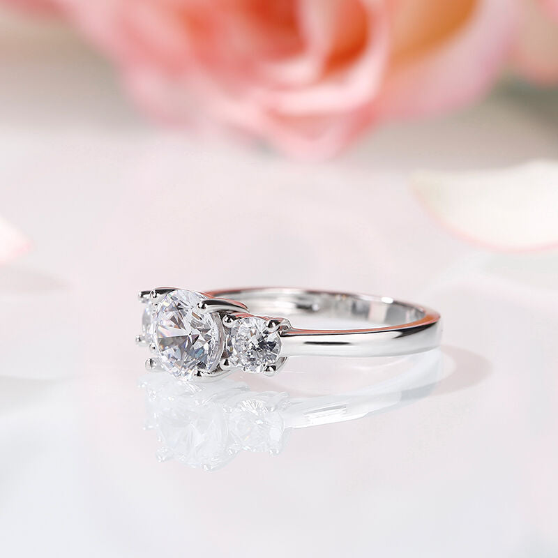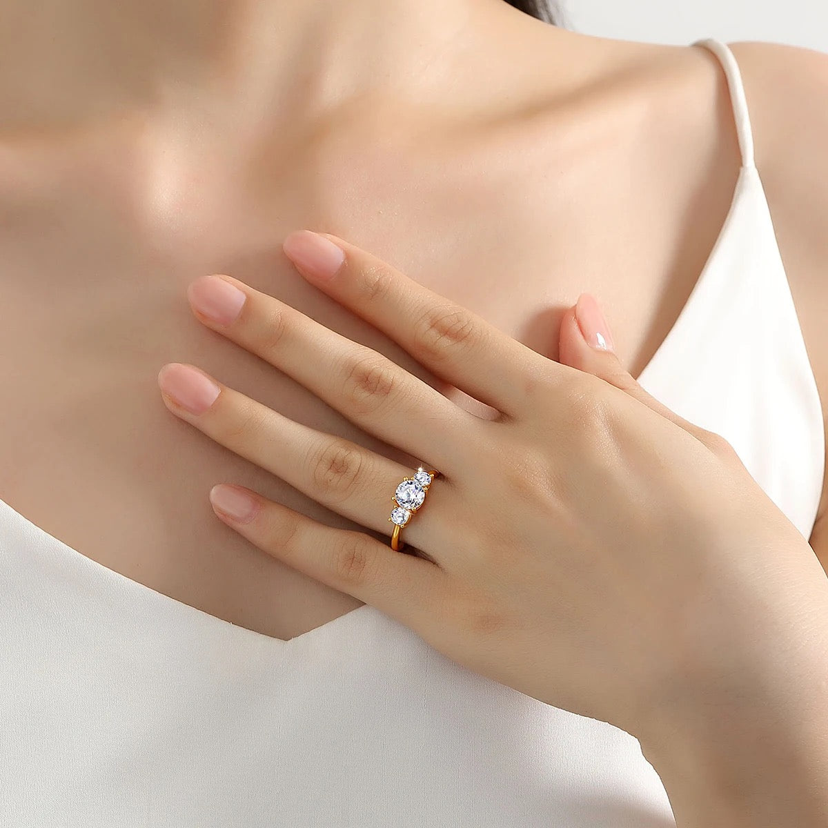 Gift your loved one with a symbol of your everlasting love with Julia's 18k Gold 3 stones round cut ring. With a sparkling center stone and two smaller stones on either side, this elegant and dazzling ring is a perfect representation of your devotion. A beautiful choice for any special occasion.
